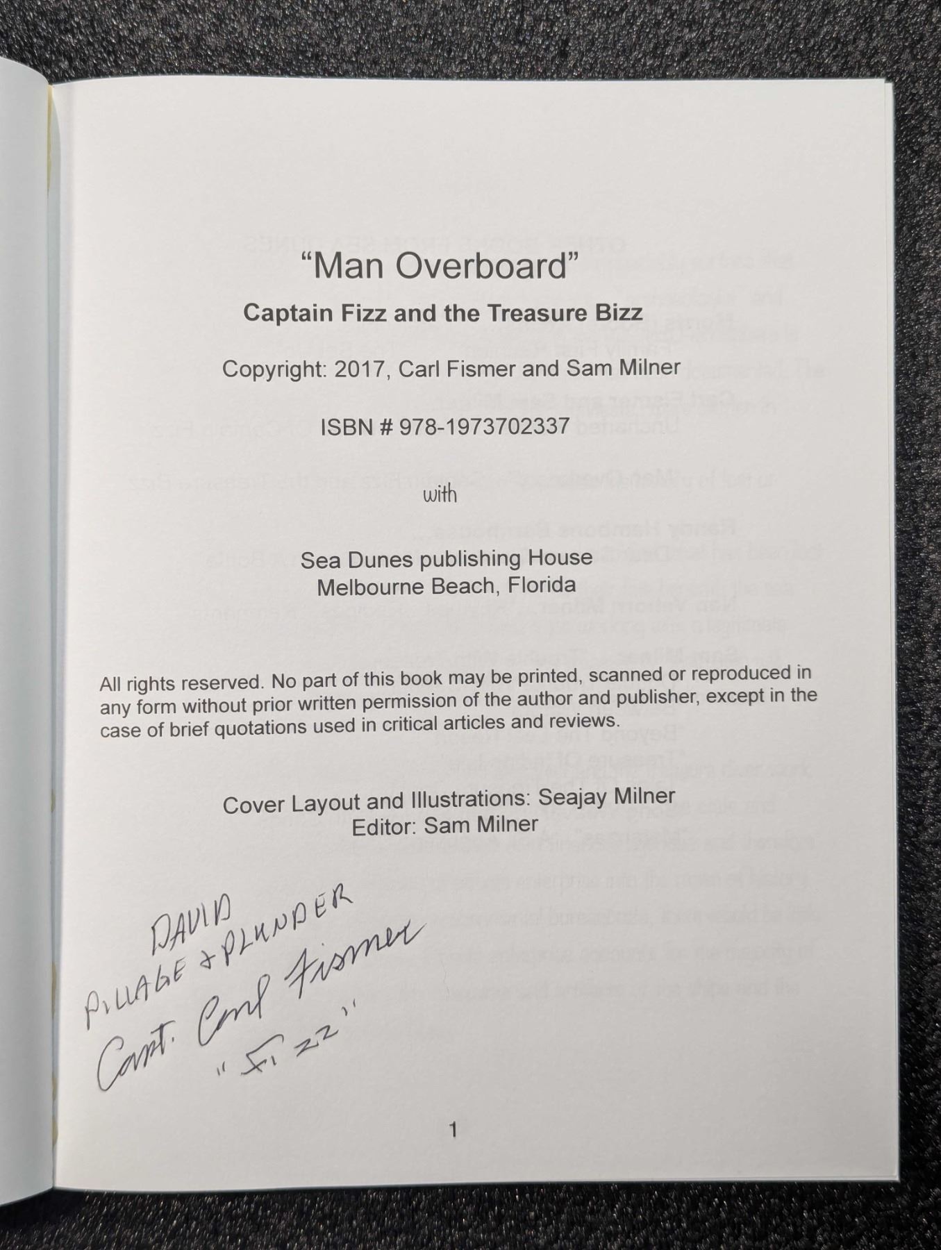 Fismer, Carl & Sam Milner. MAN OVERBOARD - CAPTAIN FIZZ AND THE TREASURE BIZZ. Sea Dunes Publishing, Melbourne Beach. 2017. 4to. 94, (2) pages. original pictorial card covers. Inscribed by the author to David Baker. Bibliography. Maps. B&w photos and illustrations throughout. English text. The David Baker Library. Fine. This book is a collection of treasure stories, including stories of humor, daring, corruption, and deceit. You see the treasure business as seen through the eyes of a successful treasure hunter..told with a very entertaining and engaging style. Lot weight: 0 lbs 9oz. Subject(s): Sunken Treasure.