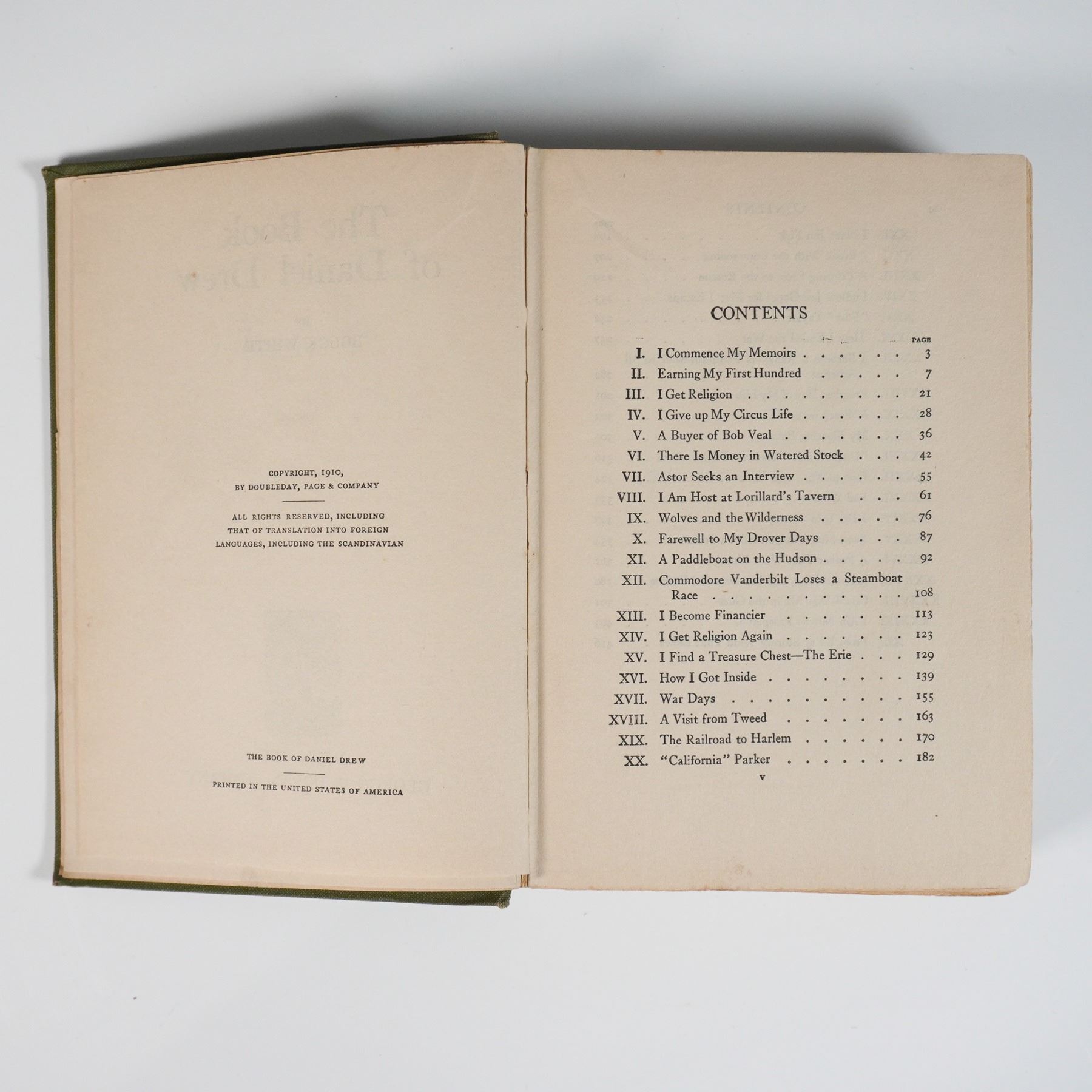 This first edition of The Book of Daniel Drew by Bouck White, published in 1910 by Doubleday, Page & Company, provides a vivid account of the life of Daniel Drew, a 19th-century financier and railroad magnate known for his role in Wall Street speculation. The book, bound in olive green cloth with gilt lettering on the spine, features Drew's memoirs, chronicling his rise from cattle drover to one of the most infamous figures in early American finance. The volume includes 20 chapters detailing his business dealings, financial strategies, and notable historical events. Measures 5.25"L x 1.25"W x 7.75"H.