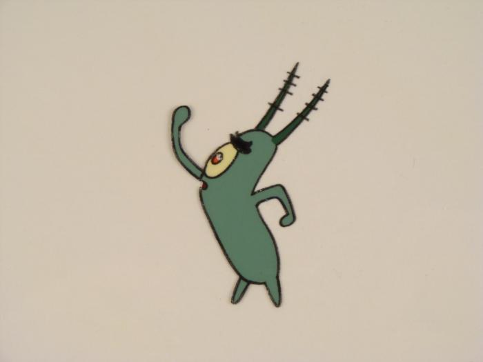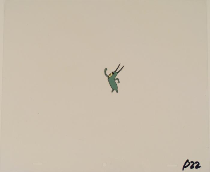 This original animation cel is from the Nickelodeon TV show SpongeBob Squarepants. The story takes place under the deep blue sea in Bikini Bottom, where SpongeBob resides. SpongeBob, who is a yellow, porous sponge, is your typical happy-go-lucky character, as he is always cheerful and enjoys making people laugh. Patrick Star, SpongeBob's Starfish neighbor, boasts knowing nothing and is often getting himself into ridiculous situations. Between the homes of these two lies the home of the miserable Squidward, a squid, who is known for being grouchy and playing tricks on SpongeBob and Patrick. Both SpongeBob and Squidward work at the Krusty Krab, a fast food business run by the greedy money-loving Mr. Krabs, a crab, the arch rival of the evil, possibly misunderstood, Plankton. Another neighbor, Sandy Cheeks, an athletic squirrel who normally wears an astronaut's space suit, was introduced in "Tea at the Treedome." She spends most of her time inventing and experimenting. In this cel the domineering Plankton is waving his fist, from a scene that included SpongeBob. Original Production Animated Cel Overall Size of Cel: 10 1/2" x 12 1/2" Excellent Condition; minor outline wearThis is an original hand-painted cel set-up used in the production of an episode of "SpongeBob SquarePants." Each one-of-a-kind set-up represents a slight change in position of the characters. When individually photographed and projected in rapid succession, the images appear to move.