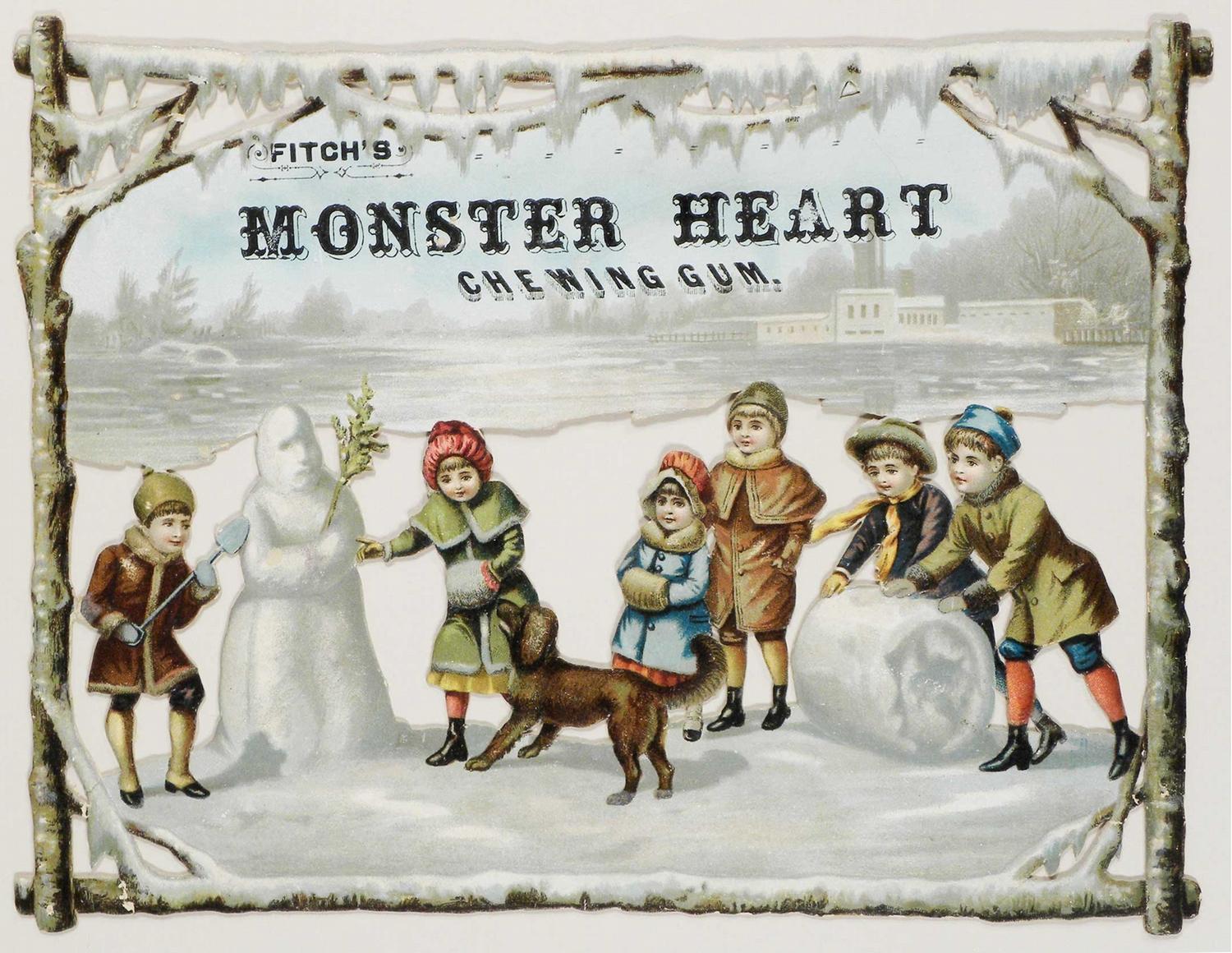 Fitch's Monster Heart Gum Embossed Die Cut Cardboard Sign. Depicting children at play in winter scene, glitter embellishment. Framed under glass. Small rub on "A" in heart and repair in lower right corner otherwise excellent condition. 9 1/2 X 7 inches image only.