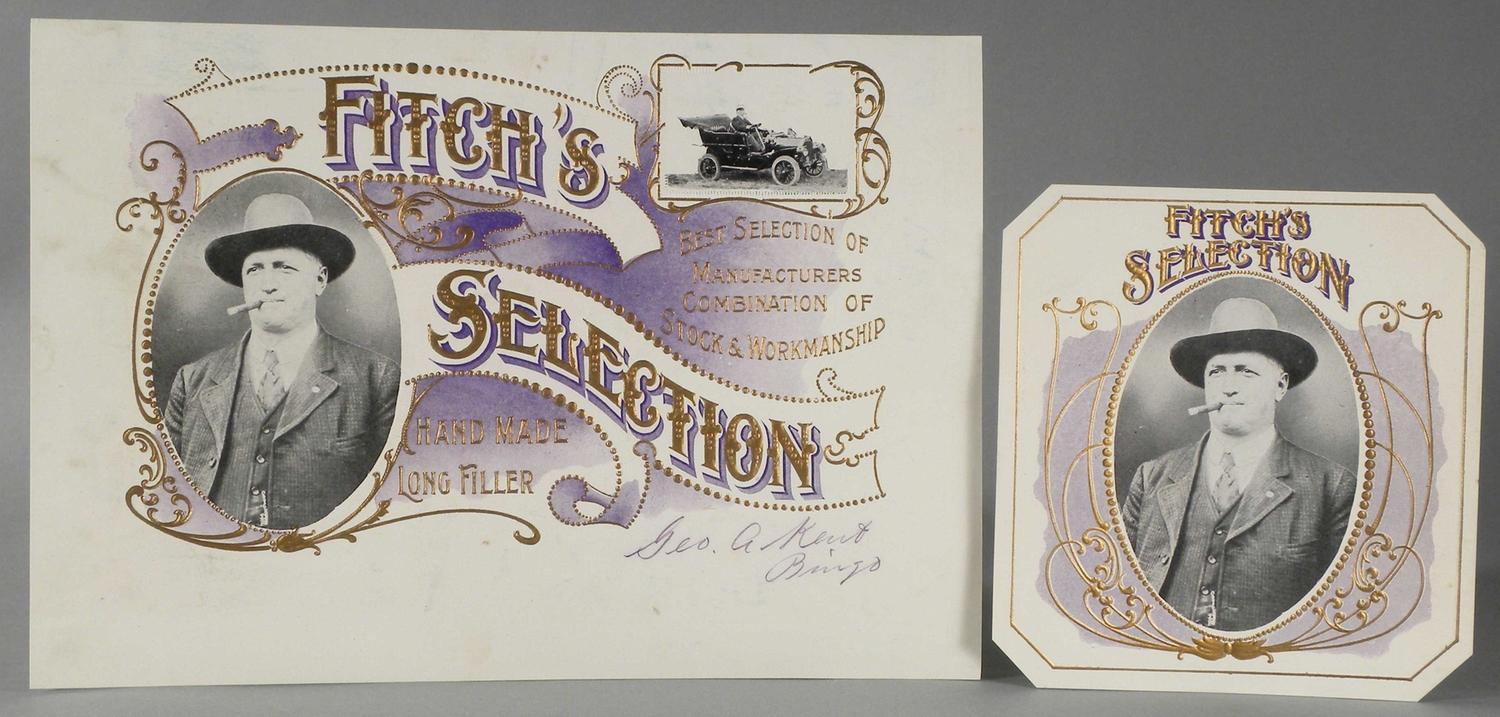 "Fitch's Selection" 2pc Embossed Cigar label set. Excellent condition. 6 1/4 X 9 and 4 1/2 X 4 7/8 inches. Start Price $50