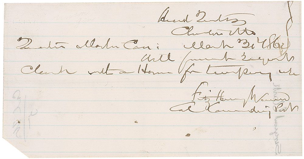 Union general and politician (1816–1878). War-dated ALS signed “Fitz Henry Warren, Col. Commanding Post,” one page, lightly-lined, 7.5 x 4, March 30, 1862. Brief letter to Quartermaster Carr. In full: “Will furnish Sergeant Clark with a horse for temporary use.” Letter is inlaid to a slightly larger off-white sheet. A central horizontal fold, a few stray ink marks, and light show-through from docketing on reverse, otherwise fine condition.