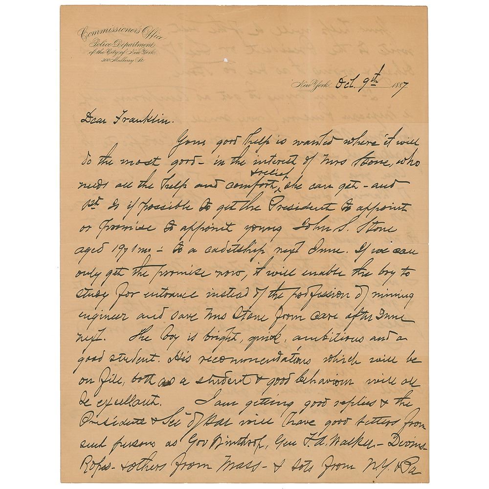 ALS signed “F. J. Porter,†one page both sides, 8.5 x 11, Commissioner's Office, New York Police Department letterhead, October 9, 1887. Letter to General Franklin, regarding the family of officer Charles Pomeroy Stone, in part: "Your good help is wanted where it will do the most good—in the interest of Mrs. Stone, who needs all the help and comfort & relief she can get—and…if possible to get the President to appoint or promise to appoint young John S. Stone aged 19y 1mo—to a cadetship next June. If we can only get the promise now, it will enable the boy to study for entrance instead of the profession of mining engineer…I am getting good replies & the President & Sec. of War will have good letters from such persons as Gov. Winthrop, Gen. F. A. Walker…& others from Mass.—& lots of from N.Y. Your help will be of the best. Will you write to the President or the Sec'y of War in his behalf." In very good to fine condition, with creasing and a short tear to the top edge, and two small areas of paper loss affecting nothing.