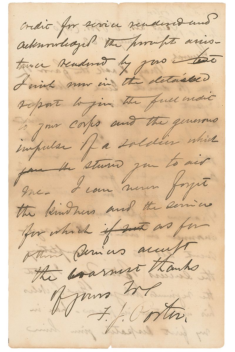 Union major general who fought at Antietam and Second Bull Run. Porter was court-martialed in 1863 for disobeying an order from Gen. Pope to attack but was exonerated in 1878. War-dated ALS signed “F. J. Porter,” one page both sides, 5 x 8, July 10, 1862. Letter to General Heintzlman. In part: “May I ask the favor of you to direct Genl. Sickles to report to me his movements and that of his brigade after you directed him to join me. I am waiting for that report to give him & his brigade credit for the excellant service rendered in the action of Malvern Heights, and the admirable manner in which that reigment did its duty completing the success of the day…I wish now in the detailed report to give the full credit to your Corps and the generous impulse of a soldier which stirred you to aid me.”
