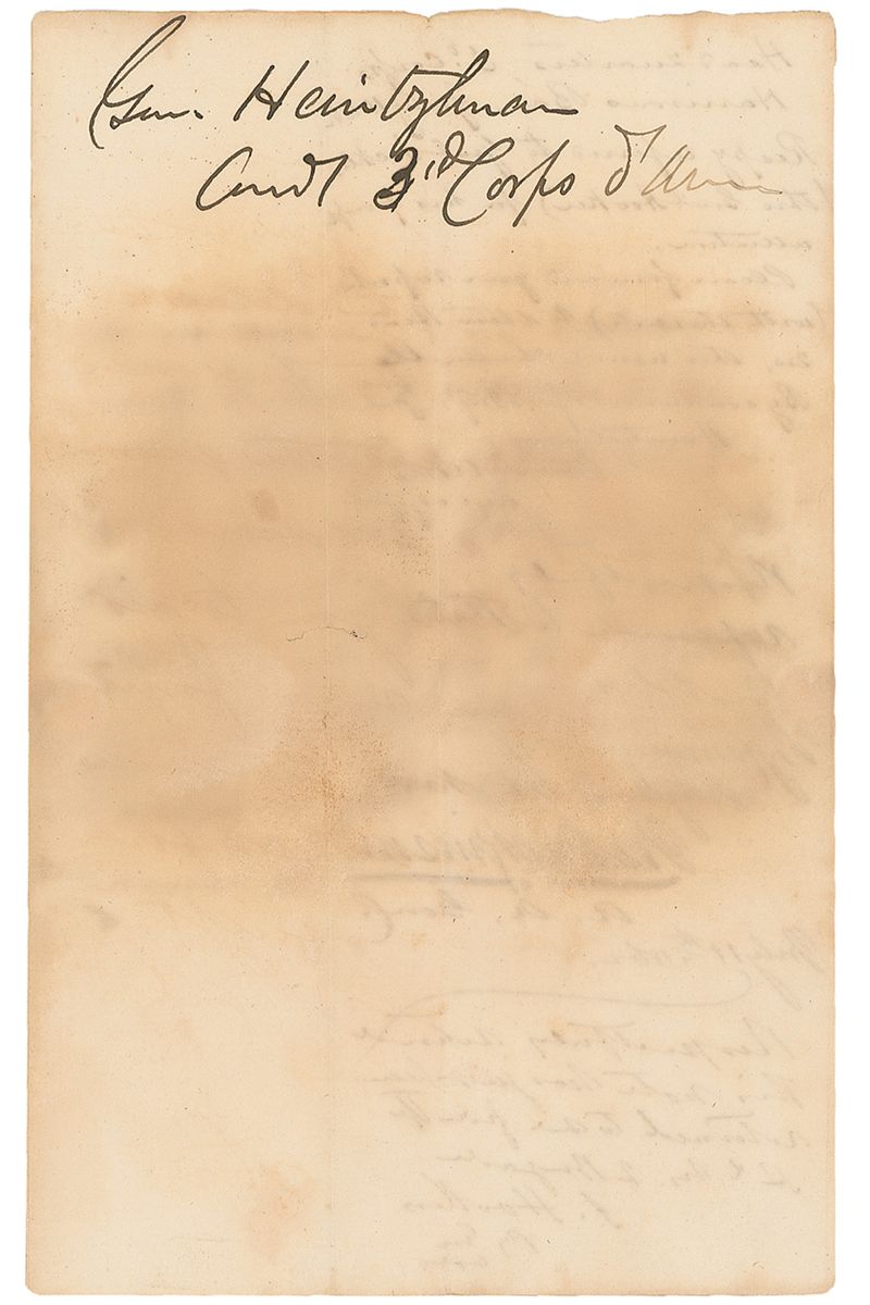 Reverse of second page bears endorsements from Isaac Moses, Joseph Dickinson, and Joseph Hooker. Intersecting folds lightly affecting Porter’s signature as well as endorsement signatures, and moderate toning and dampstaining, otherwise very good condition. Lee’s army had an opportunity to intercept the Union Army at the Battle of Glendale on June 30, but poorly executed orders allowed his enemy to escape to a strong defensive position on Malvern Hill. At the Battle of Malvern Hill on July 1, Lee launched futile frontal assaults and suffered heavy casualties in the face of strong infantry and artillery defenses. Porter played a key role at Malvern Hill, preparing the area by clearing timber providing greater visibility and larger killing zones. Despite a complete lack of military experience, Sickles’ Excelsior Brigade performed well in the Seven Days Battle, with General Lee’s army suffering over 5,000 casualties at that battle alone.