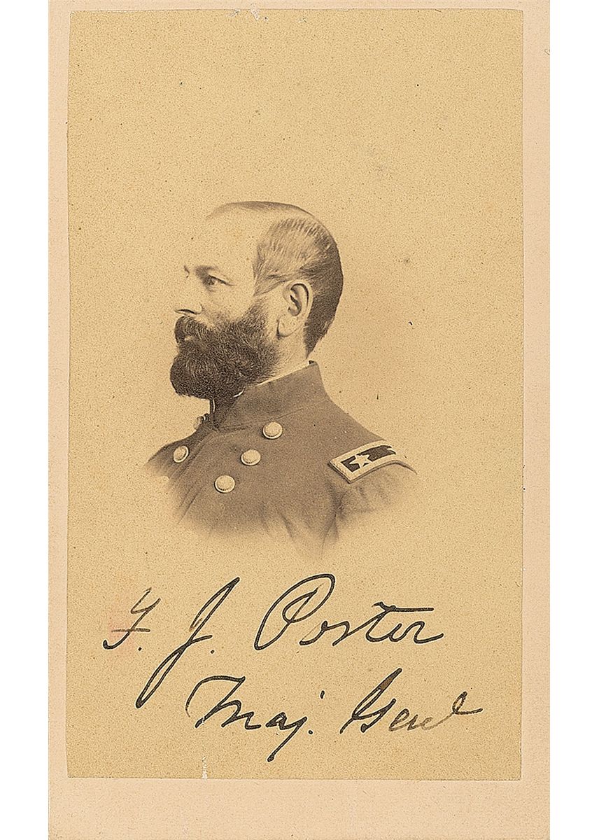 Union major general who fought at Antietam and Second Bull Run. Porter was court-martialed in 1863 for disobeying an order from Gen. Pope to attack but was exonerated in 1878. Scarce original 2.25 x 4 carte-de-visite photo of Porter in uniform by Addis of Washington, D. C.,signed in black ink under the image, “F. J. Porter, Maj. Genl.” In fine condition, with a couple trivial dings to background. The first signed image of Porter we have offered.