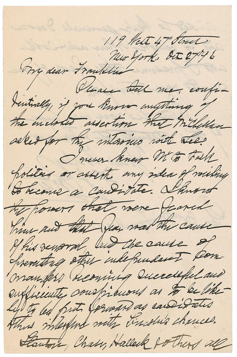 Union major general who fought at Antietam and Second Bull Run. Porter was court-martialed in 1863 for disobeying an order from Gen. Pope to attack but was exonerated in 1878. ALS signed “F. J. Porter,” one page both sides, 5.25 x 8, October 27, 1896. Letter to General William B. Franklin. In full: “Please tell me, confidentially, if you know anything of the enclosed assertion that McClellan asked for the interview with Lee. I never knew McC to talk politics or assert any idea of wishing to become a candidate. I know the powers that were feared him and that fear was the cause of his removal and the cause of preventing other independent commanders becoming successful and sufficiently conspicuous as to be likely to be put forward as candidates & thus interfere with Lincoln’s chances. Stanton, Chase, Halleck & others all aided to keep generals down and to remove when desirable and I presume that fear of you caused your transfer.” In fine condition, with a light brush to signature.