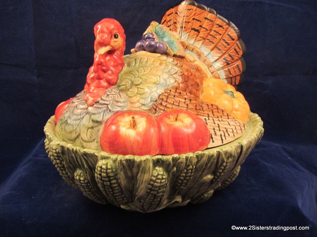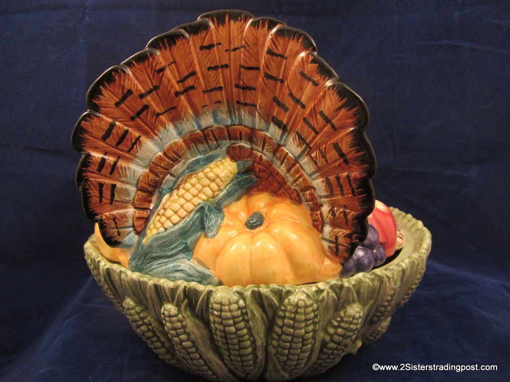 1993 Fitz & Floyd 'Autumn Bounty Collection' Turkey 1.25 quart covered vegetable bowl. This is a retired design shows no signs of cracks, crazing or other blemishes on the outside, is in very fine used condition. Measures approx. 9.25" T x 9.5" Diameter NOTE: there are 3 tiny flea bites all with a half an inch of each other on inside rim of the bowl see images for details is not in original box