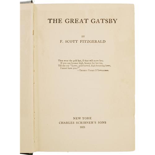 <B>F. Scott Fitzgerald Association Copy:<I> The Great Gatsby.</B></I></B></I> (New York: Scribner's Sons, 1925), first edition with all correct first issue points, 218 pages, original dark cloth with titles in blind on the front cover and gilt titles on the spine, 12mo (5.5" x 7.75"), uniform toning to pages throughout, ghosting at the front and rear endpapers, light shelf wear to boards, else very good.<BR><BR>The copy on offer is inscribed on the ffep by Fitzgerald's mother, Mary (Mollie) McQuillan. She has written in large hand "<I>For Mrs. Harlow/ From the mother of the author/ Washington/ July 1925</B></I>". Included is a personal letter, dated April 7, 2006 from the granddaughter of Mrs. Harlow that details the relationship her grandmother's family had with the Fitzgeralds. There are two original photos, one of Fitzgerald's daughter Scotty, the other of Scotty with Faith Harlow, daughter of Mrs. Harlow at the Harlow's residence, "Journey's End". There are several newspaper clippings with stories of F. Scott Fitzgerald's death on the front and back endpapers. A highly collectible association copy of a rare book.<BR><BR><b>Shipping:</b> Books & Catalogs (<a target="_blank" href="http://www.heritageauctions.com/common/shipping.php">view shipping information</a>)
