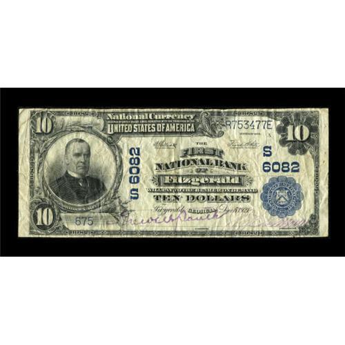 <B>Fitzgerald, GA</B></I> - $10 1902 Plain Back Fr. 634 <B>The First NB</B></I> Ch. # (S)6082<BR> A rather scarce note from the first of four issuers in this small Ben Hill County location. <B>Fine,</B></I> with purple signatures. <BR><BR><b>Shipping:</b> Coins & Currency (<a target="_blank" href="http://www.heritageauctions.com/common/shipping.php">view shipping information</a>)
