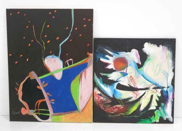 Oil on canvas. Unframed. One signed on rear, Oldak 69. One signed Fitzgerald lower left & titled "Dark Garden". Larger, Fitzgerald, approx. 48" x 36". Oldak, approx. 36" x 34".