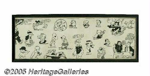 <B>Fitzgerald - "The Comic Characters in Review" Illustration Original Art (1934).</B></I> Here's a piece of comics history as seen through the eyes of a contemporary cartoonist of those times. Fitzgerald presented an illustration of twenty two of the most popular comic strips of the time. Popeye, Jeff (of <I>Mutt and Jeff</B></I>), Little Orphan Annie and Sandy, Andy Gump, Skeezix, Felix, Jiggs, Simp O'Dill, Maw Green, and others all appeared. The image area measures 7.5" x 22", and with some slight aging overall, the art is in Very Good condition.