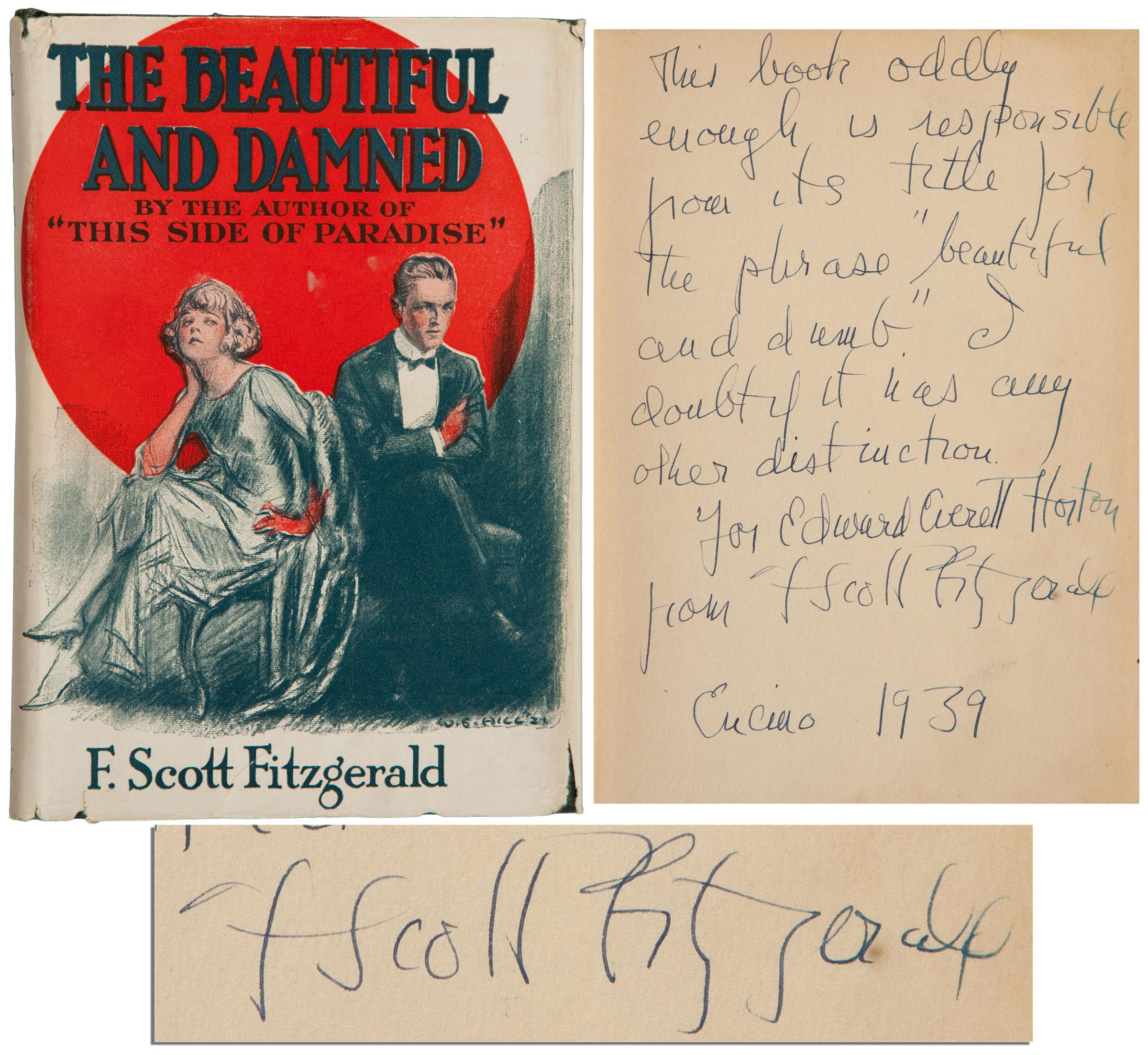 Signed and inscribed first edition, third printing of F. Scott Fitzgerald's ''The Beautiful and Damned.'' New York: Charles Scribner's Sons: 1922. As Fitzgerald's second novel, the story paints a vivid portrait of the Eastern elite during the Jazz Age in America. Copy is inscribed by Fitzgerald on the front free endpaper: ''This book oddly enough is responsible from its title for the phrase 'beautiful and dumb.' I doubt if it has any other distinction. For Edward Everett Horton from F. Scott Fitzgerald / Encino 1939.'' In publisher's original green cloth boards with some soiling. Includes a later printing dustjacket from the A.L. Burt edition with minor wear. Very good condition.