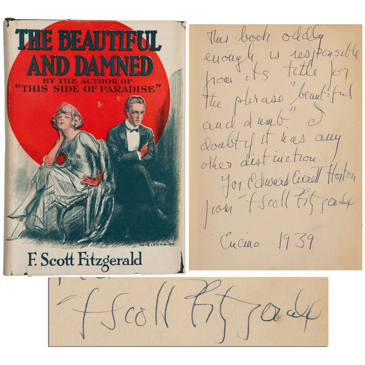 Signed and inscribed first edition, third printing of F. Scott Fitzgerald's ''The Beautiful and Damned.'' New York: Charles Scribner's Sons: 1922. As Fitzgerald's second novel, the story paints a vivid portrait of the Eastern elite during the Jazz Age in America. Copy is inscribed by Fitzgerald on the front free endpaper: ''This book oddly enough is responsible from its title for the phrase 'beautiful and dumb.' I doubt if it has any other distinction. For Edward Everett Horton from F. Scott Fitzgerald / Encino 1939.'' In publisher's original green cloth boards with some soiling. Includes a later printing dustjacket from the A.L. Burt edition with minor wear. Very good condition.