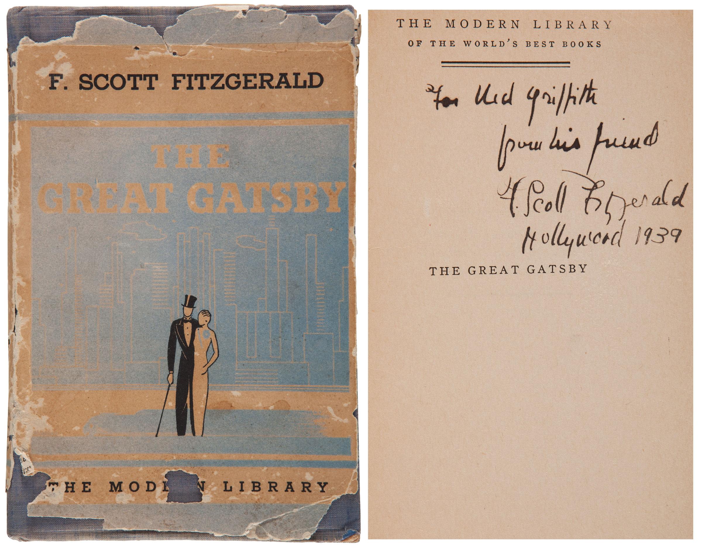 Coveted signed copy of F. Scott Fitzgerald's masterpiece novel, ''The Great Gatsby.'' Modern Library: New York, 1934, which included the first appearance of the author's new introduction. Signed and inscribed by Fitzgerald to actor Ned Griffith: ''For Ned Griffith / from his friend / F. Scott Fitzgerald / Hollywood 1939''. Fitzgerald's new introduction to ''Gatsby'' reads in part: ''…I think it is an honest book, that is to say, that one used none of one's virtuosity to get an effect, and, to boast again, one soft-pedalled the emotional side to avoid the tears leaking from the socket of the left eye…'' In original publisher's blue cloth boards with gilt lettering to spine, though sun-faded in spots. The Modern Library torchbearer emblem is stamped in gilt on front board and the endpapers are printed in orange. With a ''Stanley Rose Bookshop'' ticket affixed to rear pastedown. Lower corner of front board is bumped and a tiny .25'' hole appears to lower corner of front free endpaper; overall, book is in very good condition. Includes original dustjacket in fair condition, with price clipped, significant chips and some paper loss. An incredibly rare signed copy of Fitzgerald's great novel, with a still bold inscription and signature.