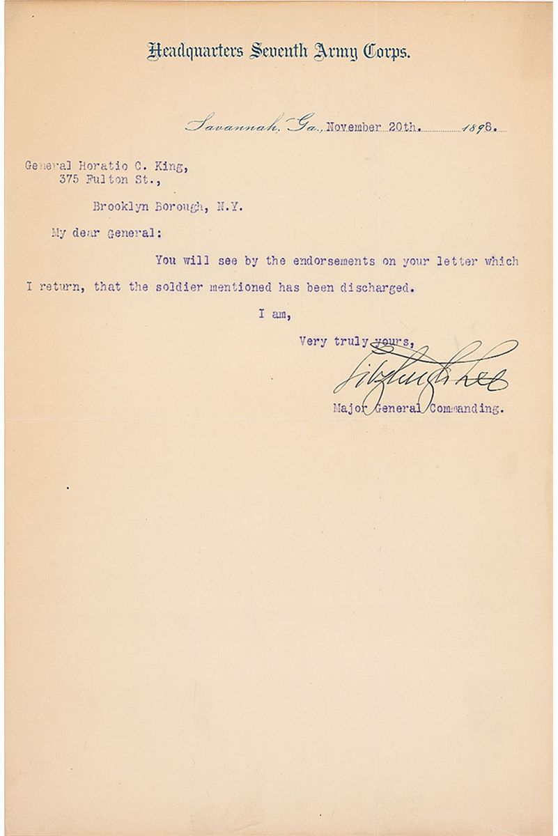 TLS, one page, 8 x 10.5, Headquarters Seventh Army Corps letterhead, Savannah, Georgia, November 20, 1898. Letter to General Horatio C. King. In full: “You will see by the endorsements on your letter which I return, that the soldier mentioned has been dis