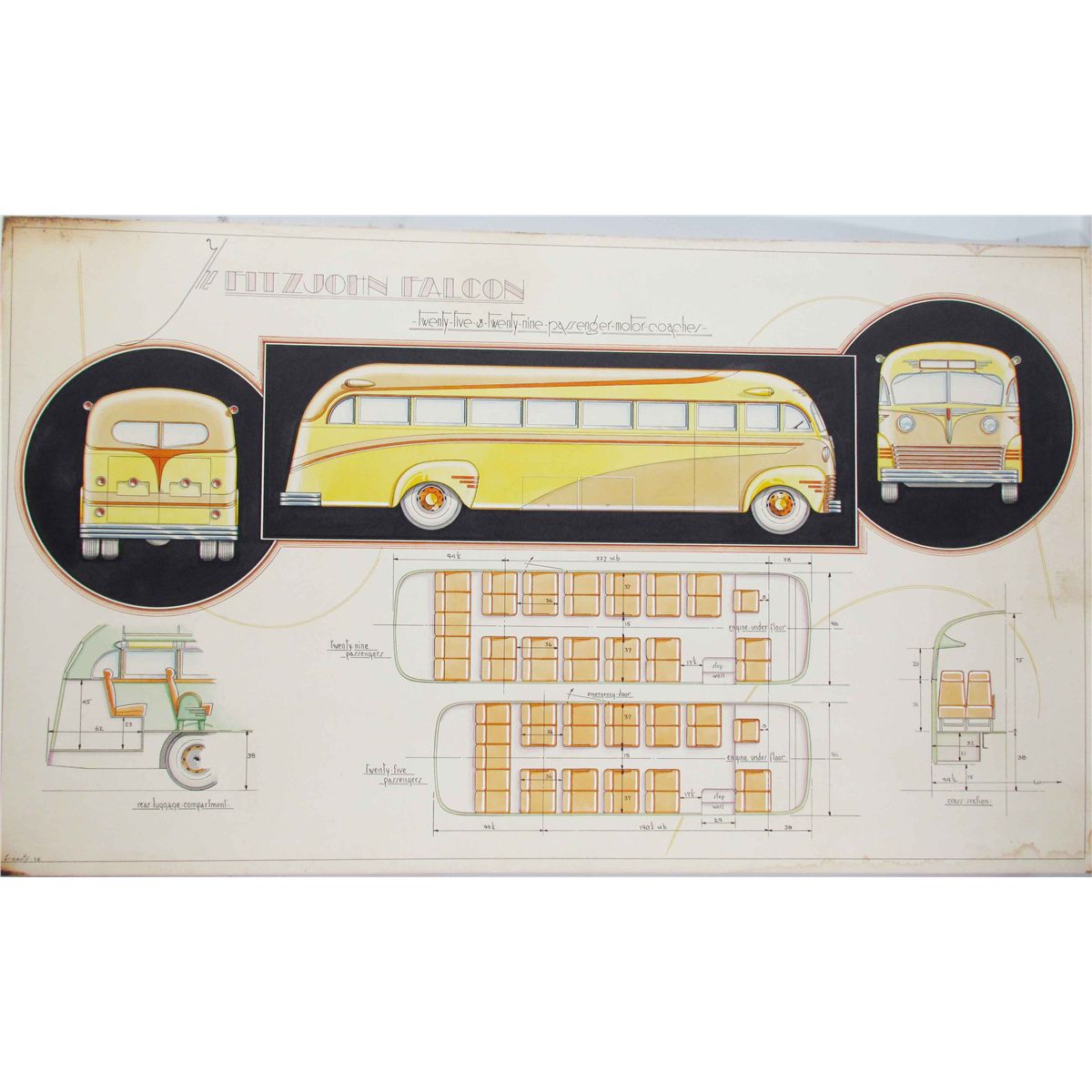 Fitzjohn Falcon 25/29 Passenger Motor Coach Original Blueprint Drawing. Hand colored in original leather portfolio. Slight staining on corners otherwise very good condition. 2903/4 X 17 1/2 inches.