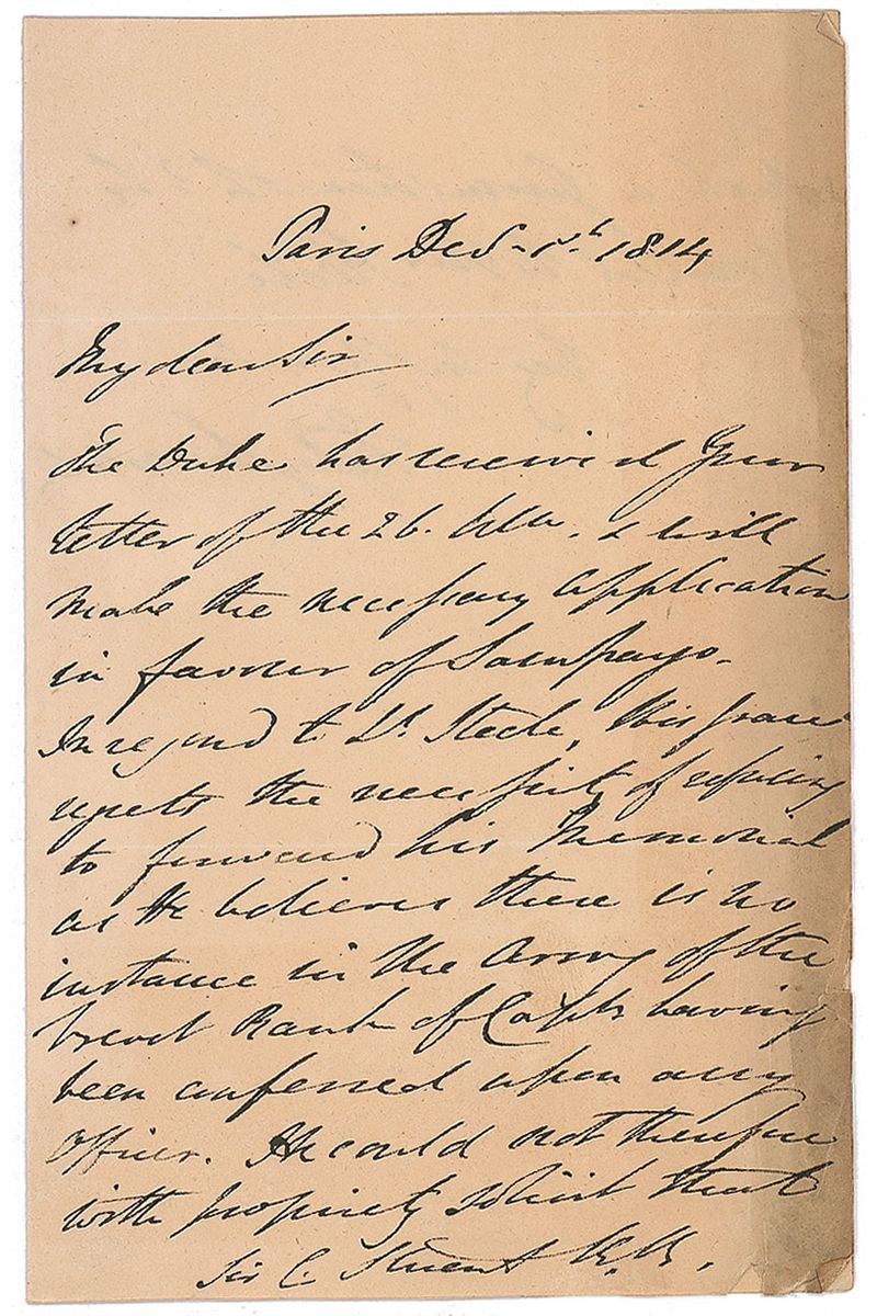 British soldier (1788–1855) and 1st Baron Raglan, GCB, PC. ALS, one page both sides, 4.5 x 7, December 1, 1814. Letter to Sir Charles Stuart, when Somerset was an aide to the Duke of Wellington, shortly before Waterloo. In part: “In regard to Lt. Steke, His Grace [the Duke of Wellington] regrets the necessity of refusing to forward his Memorial as he believes there is no instance in the Army of the Brevet Rank of Captn having been conferred upon any officer.” In very good condition, with uniform toning, heavier toning and dampstaining along right edge, and a few small edge tears. Decades later, Somerset, now Lord Raglan, commanded the British forces in Crimea and ordered the famous Charge of the Light Brigade.