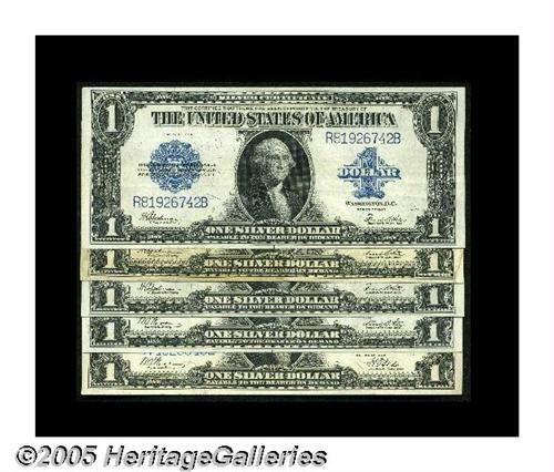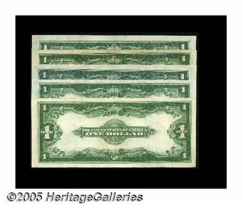 <B>Five $1 Silvers,</B></I> including Fr. 237 <B>Fine</B></I> and <B>VF-XF;</B></I> Fr. 237 Star <B>XF-AU;</B></I> Fr. 238 <B>Choice New;</B></I> and Fr. 239 <B>XF.</B></I><BR>This is an interesting lot that includes the scarce Woods-Tate signature combination.<BR>