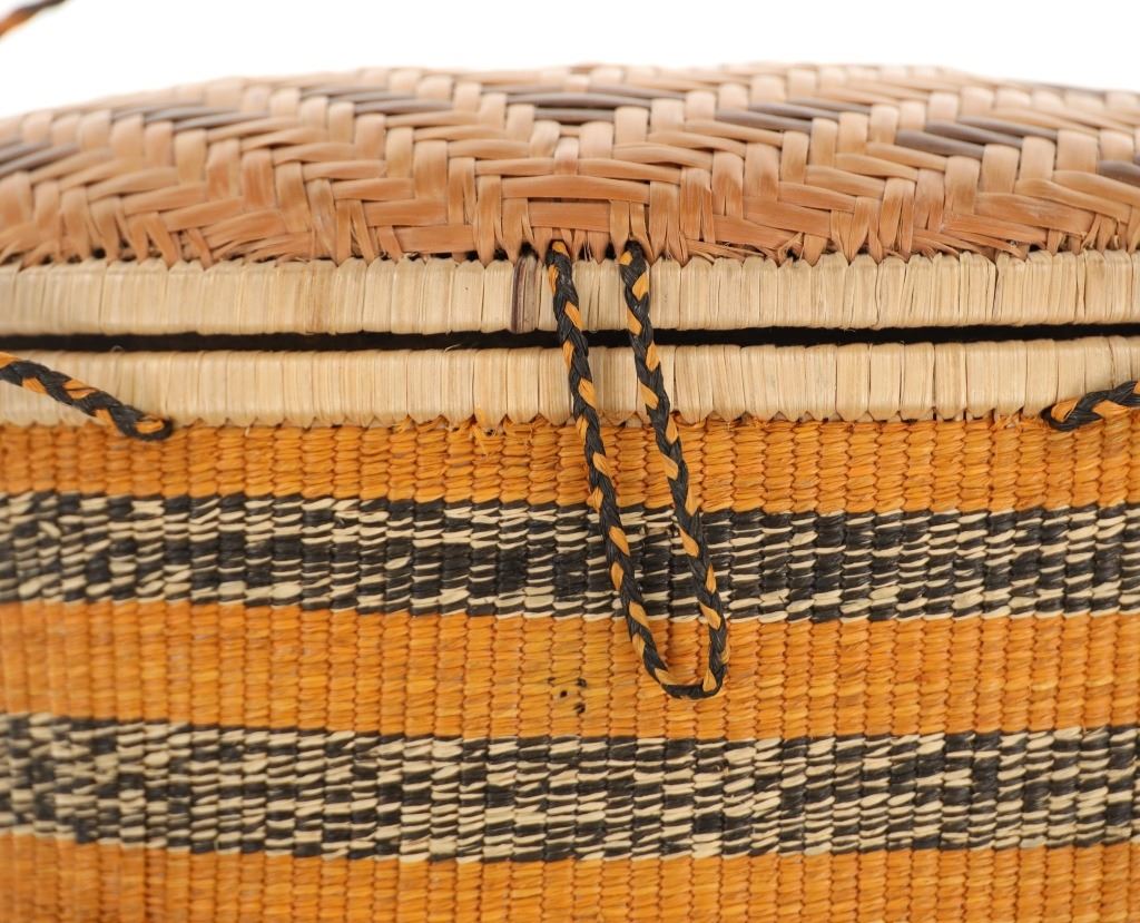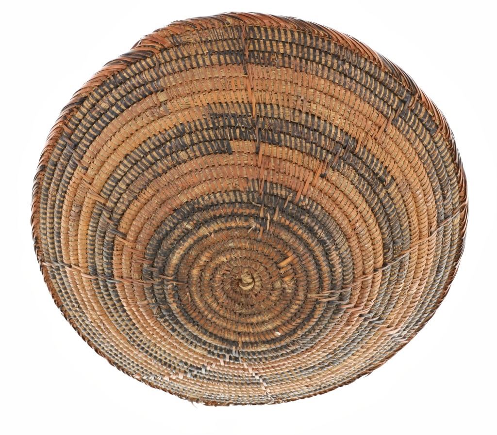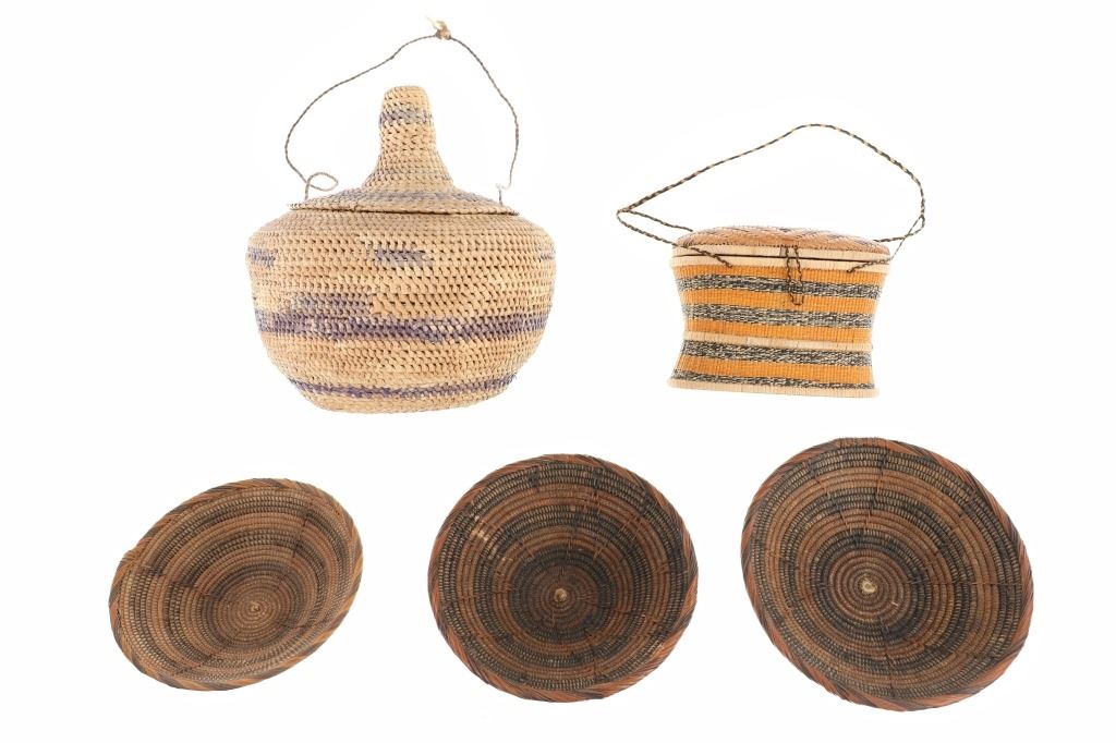 Offered in this lot are Five (5) assorted East African Raffia Baskets: three (3) round coil bowls / baskets, one (1) woven storage basket with lid and carrying cord, and one (1) coil storage basket with lid and carrying cord. Traditionally used for serving food, these baskets make for amazing wall décor, especially in collections featuring various sizes and patterns. Raffia is a natural material that is perfect for basket making. It comes from the leaves of the raffia palm, soft to the touch, sports a very fine weave, and holds dyes superbly. Weavers construct these baskets by wrapping colorfully dyed palm raffia around a coil of bukedo, the local term in Uganda for banana leaf stalks. The large banana leaf stalks are pulled apart into long, thin strips, then dried, and then bundled into coils and wrapped with raffia. These baskets are in nice condition, with minor scuffing noted. The round baskets measure 9.75" diameter x 3"H, 10.5" diameter x 3"H, 11.25" diameter x 3"H; the woven storage basket is 10.5" diameter x 11.5"H; the coil storage basket is 8.75"L x 6.5"H.