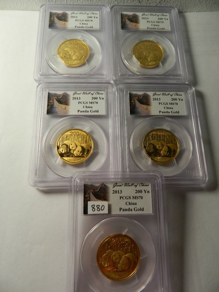 Five (5) Gold China 2013 200Y Panda, PCGS MS70, 1/2 ounce Fine Gold Each, all five one money