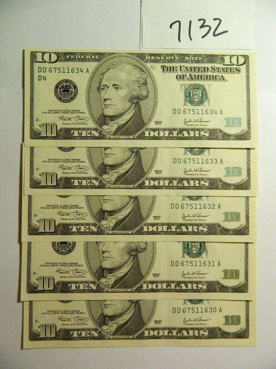 Five (5) Sequentially Numbered 2003 $10 Bills, UNC, All One Money, Nice estate Find!