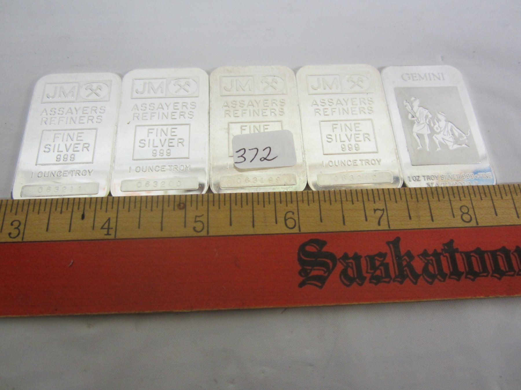 Five .999 Pure Silver 1 OZ Bars (5 Troy OZ)