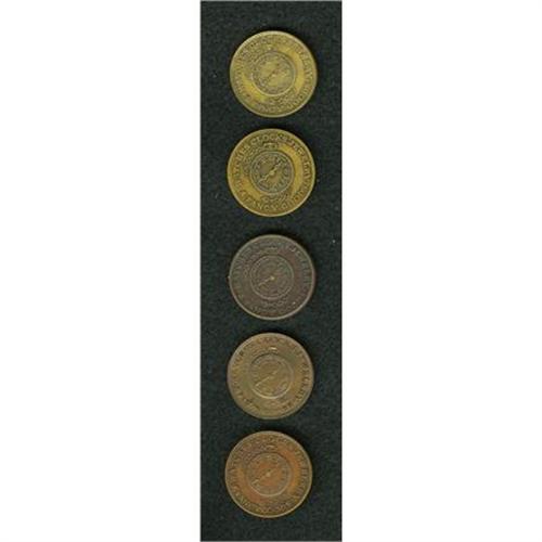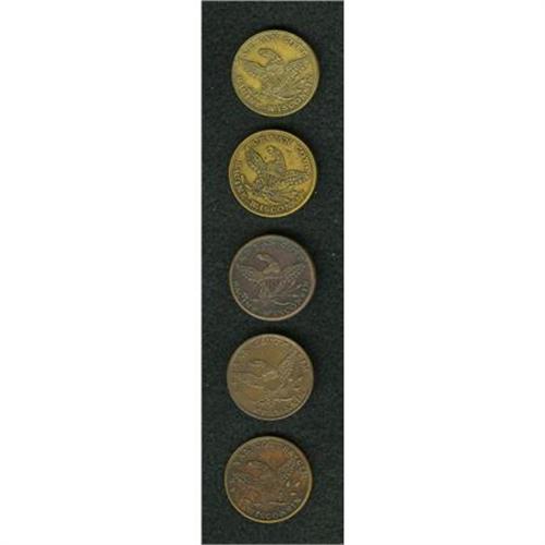 <B>Five A.B. Van Cott Store Cards.</B></I> The lot includes: <B>Miller-WI-10,</B></I> brass, thick planchet, AU; <B>Miller-WI-11,</B></I> brass, thin planchet, XF; <B>Miller-WI-12,</B></I> copper, XF with some corrosion; <B>Miller-WI-13,</B></I> brass, RACIM error, AU, a couple of small spots; and a <B>Miller-WI-14,</B></I> copper, RACIM error, XF, scratched, moderate verdigris.<BR><BR><b>Shipping:</b> Coins & Currency (<a target="_blank" href="http://www.heritageauctions.com/common/shipping.php">view shipping information</a>)