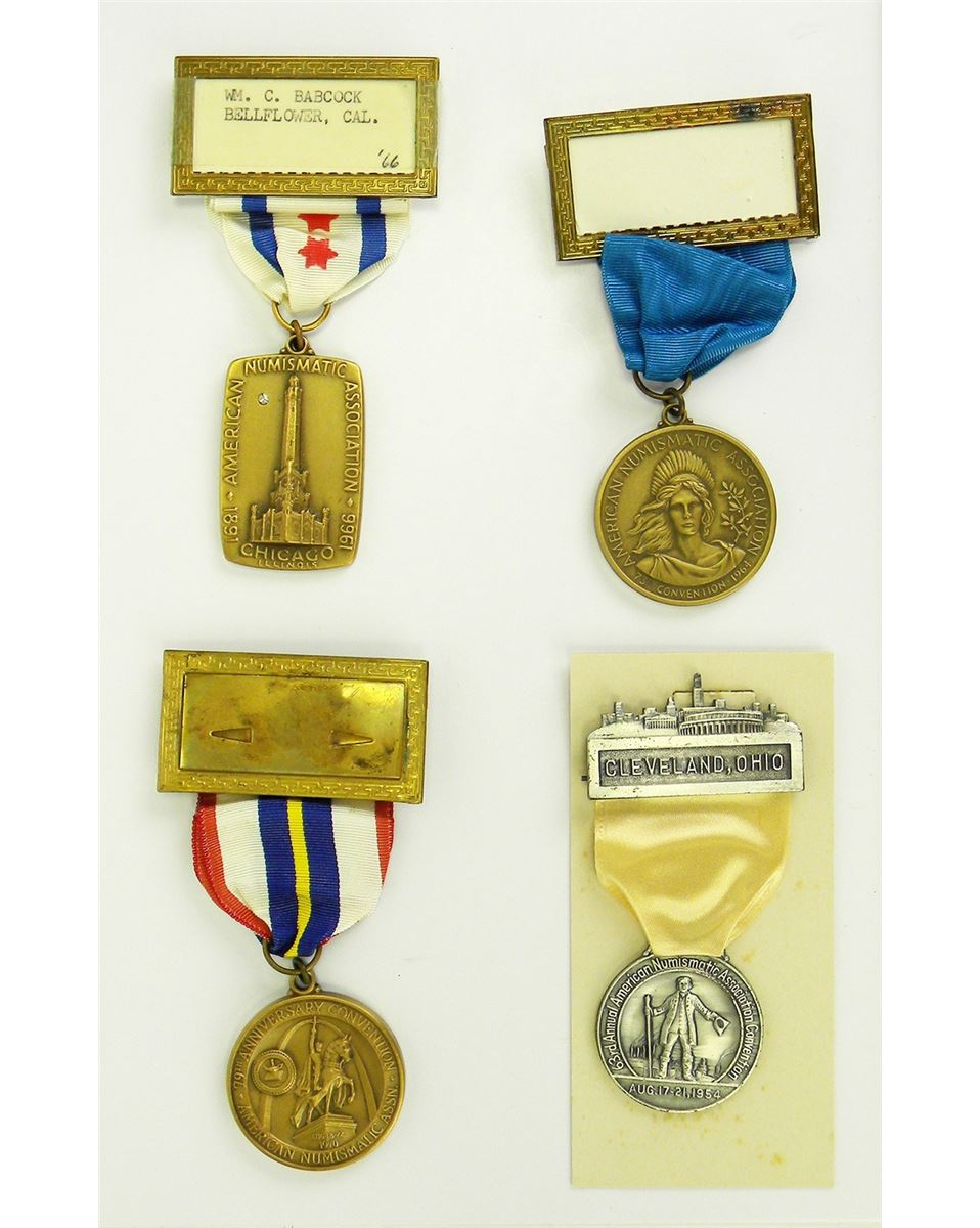 [American Numismatic Association]. FIVE CONVENTION BADGES. Includes: 1954 (Cleveland, yellow ribbon); 1954 (Cleveland, green ribbon); 1964 (Cleveland); 1966 (Chicago); 1970 (St. Louis). Nice examples, some with occasional light marks. First two on original cards; last three in original boxes. Important mementoes of ANA conventions, manufactured by the Green Duck Co. (1954) and Medallic Art Co. (the rest).