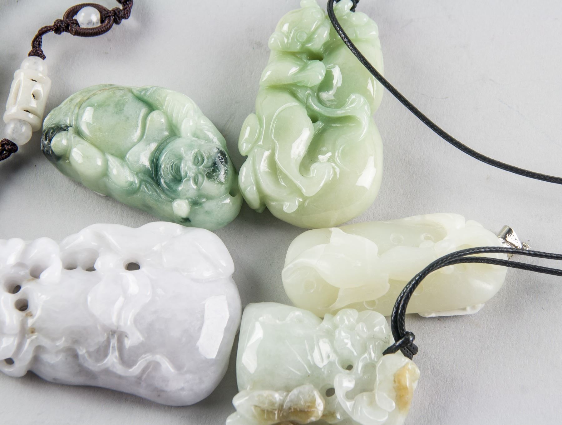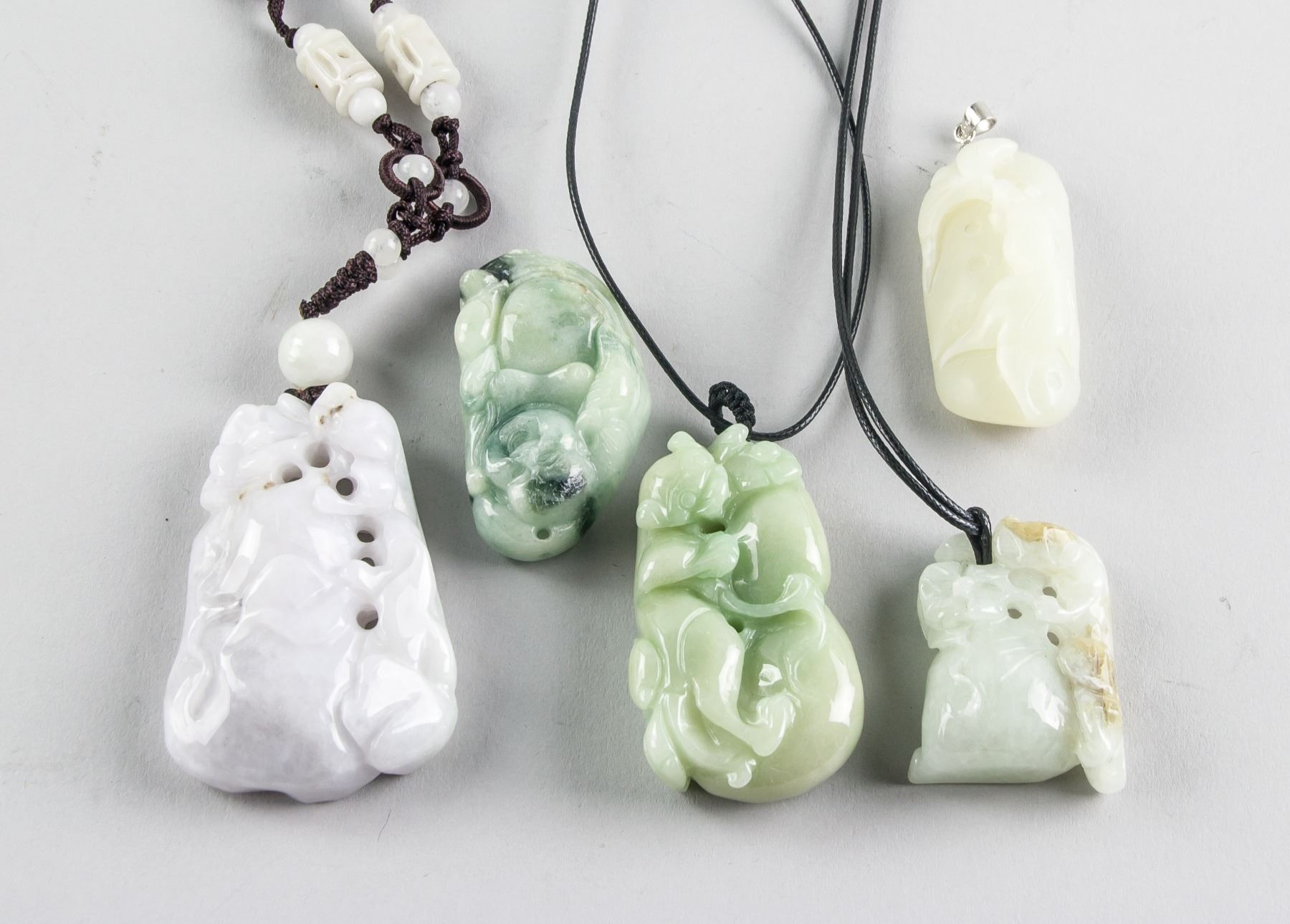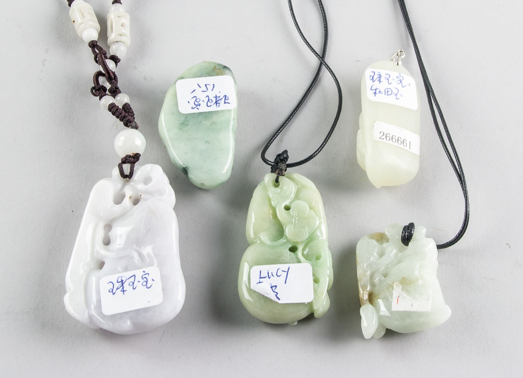 Five assorted Burma jadeite carved pendants. Total weight: 178g, length 4.5-6cm, density: 3.06-3.16. PROVENANCE: Private estate (Scarborough, ON)
