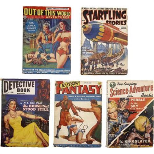<B>Five Assorted Science Fiction Pulp Magazines,</B></I> including:<BR><B><I>Out of This World</B></I></B></I> (Avon Publications, December 1950), Volume 1, Number 2. Science fiction and fantasy stories from A. Bertram Chandler, Bryce Walton, Walt Sheldon, Basil Wells, and others. Very good condition.<BR><B><I>Startling Stories</B></I></B></I> (Better Publications, Inc., November 1939), Volume 2, Number 3. Stories by Jack Williamson, Stanley Weinbaum, and others. Very good condition.<BR><B><I>Two Complete Science-Adventure Books</B></I></B></I> containing Isaac Asimov's <I>Pebble in the Sky</B></I> and L. Ron Hubbard's <I>The Kingslayer</B></I> (Fiction House Magazine, Winter 1950), Volume 1, Number 1. Very good condition.<BR><B><I>10 Story Fantasy</B></I></B></I> (Avon Publications, Spring 1951), stories by August Derleth, A. E. van Vogt, Fritz Lieber, and others. Very good condition.<BR><B><I>Detective Book Magazine</B></I></B></I> (Winter 1951-1952), Volume 6, Number 4. Cover story by A. E. van Vogt. Very good condition. A neat and diverse collection of science fiction pulps.<BR><BR><b>Shipping:</b> Books & Catalogs (<a target="_blank" href="http://www.heritageauctions.com/common/shipping.php">view shipping information</a>)