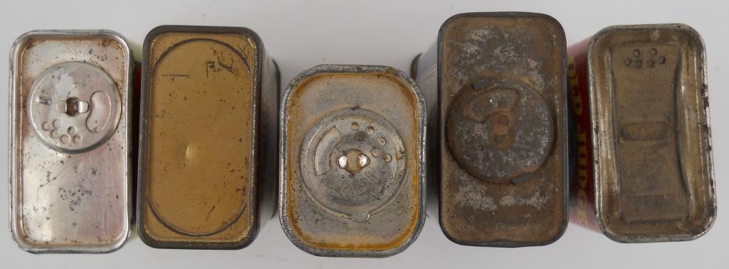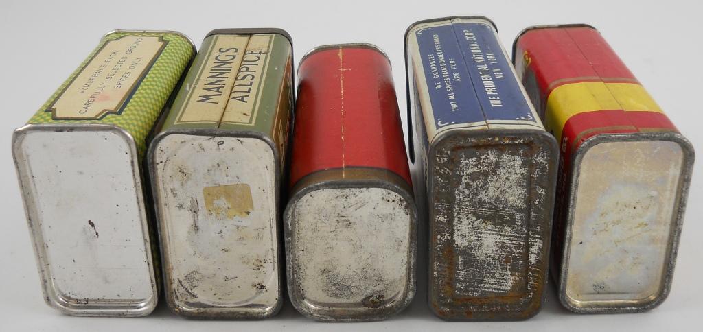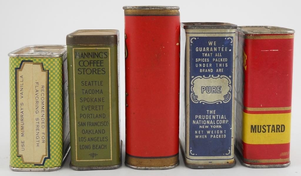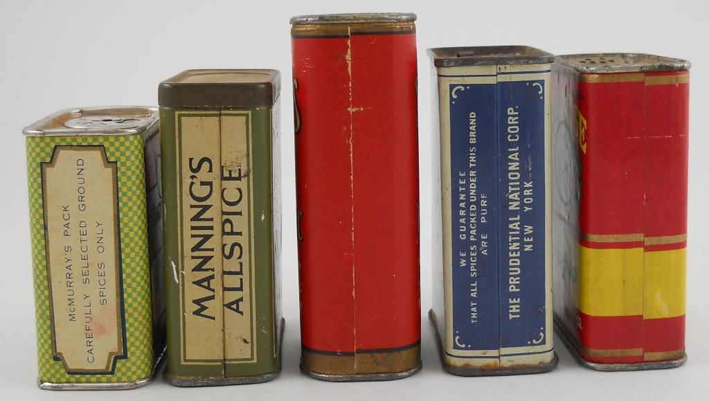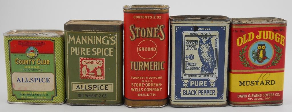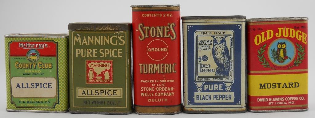 You'll get all five spice tins for one bid. The brands include: Stone's, Old Judge, Safe Owl, Manning's and County Club. They average 2-1/4 inches x 3-1/4 inches in size.