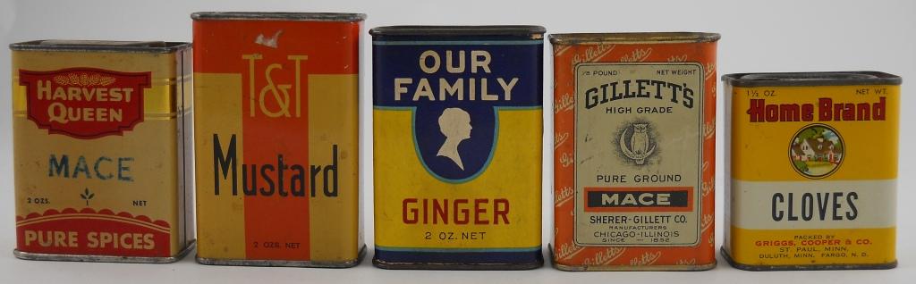 In this third group of vintage spice tins we have Harvest Queen, Home Brand, Gillett's, Our Family, and T&T. They average 2-1/2 inches x 3 inches in size.