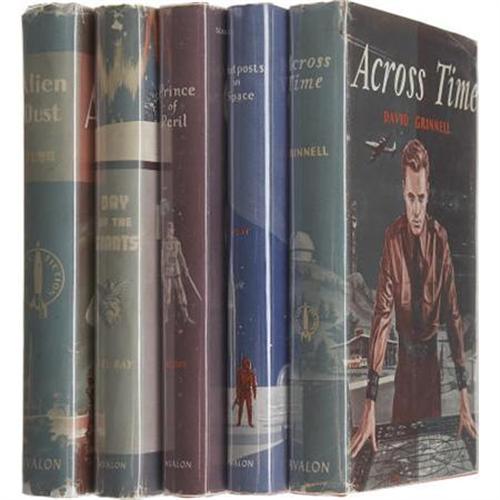 <B>Five Avalon Books.</B></I> Includes the following:<BR><B>E. C. Tubb:</B></I><B><I> Alien Dust.</B></I></B></I> (New York: Avalon Books, 1957), first edition thus, 223 pages, light gray boards, 8vo, dust jacket. Condition (book/ dj): good/ good.<BR><B>David Grinnell:</B></I><B><I> Across Time.</B></I></B></I> (New York: Avalon Books, 1957), first edition thus, 223 pages, salmon boards, 8vo, dust jacket. Condition (book/ dj): very good/ good.<BR><B>Wallace West:</B></I><B><I> Outposts in Space..</B></I></B></I> (New York: Avalon Books, 1962), first edition, 224 pages, salmon boards, 8vo, dust jacket. Condition (book/ dj): very good/ very good.<BR><B>Otis A. Kline:</B></I><B><I> Prince of Peril.</B></I></B></I> (New York: Avalon Books, 1962), first edition thus, 224 pages, red boards, 8vo, dust jacket. Condition (book/ dj): very good/ good.<BR><B>Lester Del Ray:</B></I><B><I> Day of the Giants.</B></I></B></I> (New York: Avalon Books, 1959), first edition thus, 224 pages, teal boards, 8vo, dust jacket. Condition (book/ dj): very good/ good.<BR><BR><BR><b>Shipping:</b> Books & Catalogs (<a target="_blank" href="http://www.heritageauctions.com/common/shipping.php">view shipping information</a>)