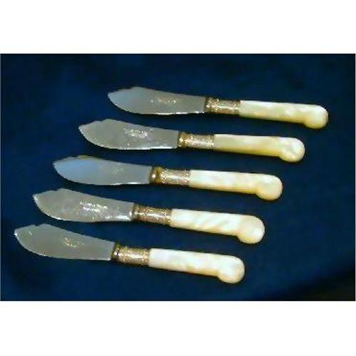 <tr><td>Title:Five Beautiful little Fruit Knives with Pearl</td></tr>