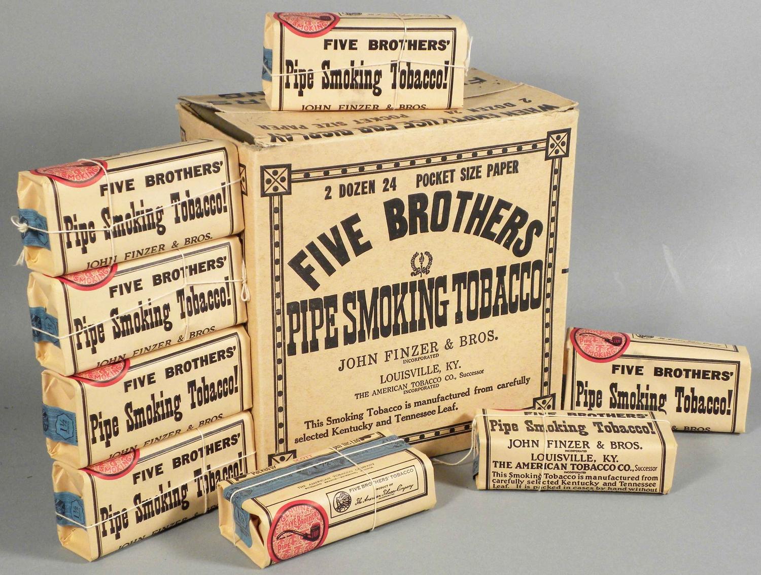 Five Brothers Tobacco Store Display Box with product. Includes 8 packs. Packs are excellent, box shows some tears and wear to lid. 8 1/4 X 8 1/4 X 4 3/4 inches. Starting bid $60