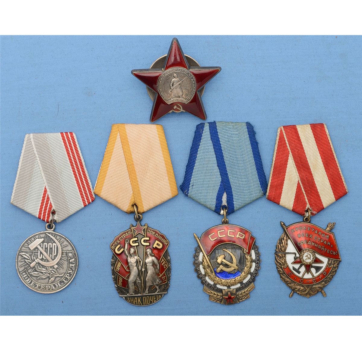 1)Order of the Badge of Honor. 2) Order of the Red Banner. 3) Veteran of Labor. 4) Order of The Red Star. 5)Order of The Red Banner of Labour. CONDITION: Excellent.