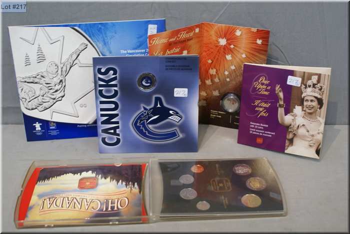 Five Canadian collector's coin sets including 2003 Home and Heart of the polar bear coin, 1998 Royal Canadian mint un-circulated coins, "A Once upon a time" keepsake booklet of 10 Golden Jubilee 50 cent pieces, a Canucks hockey commemorative coin and 17 coin Vancouver Olympics 2010 collectors set