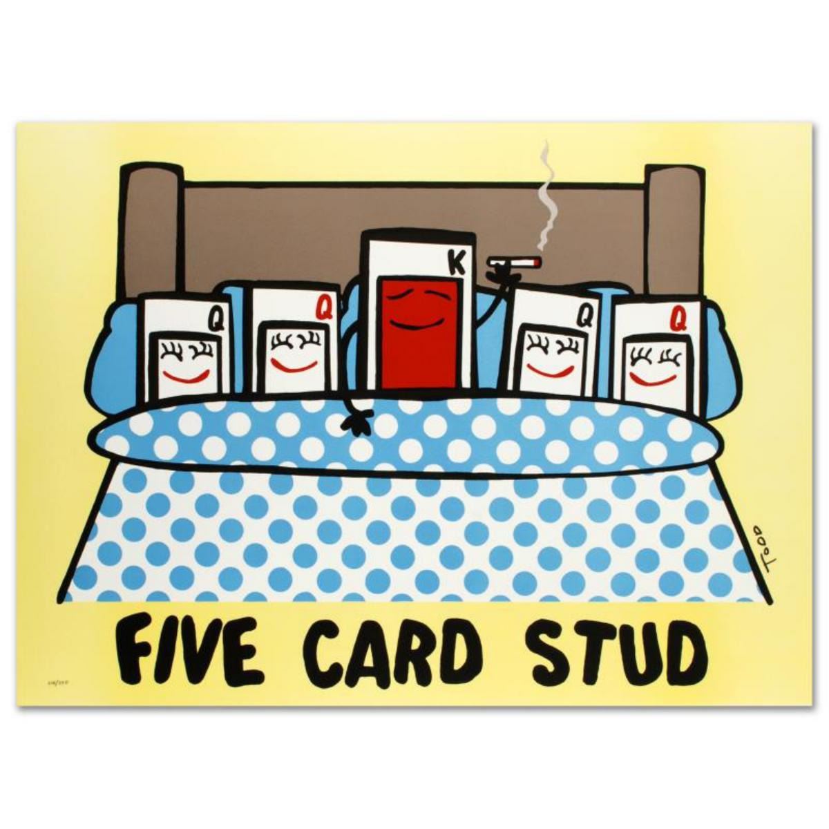 Pop artist Todd Goldman is known all across the globe for his whip-smart and wickedly funny puns and pictures! "Five Card Stud" is a limited edition lithograph on paper, numbered and hand signed by Todd. Includes Certificate of Authenticity! Measures approx. 30.5" x 22.5" (no border). Reference #: 168003.