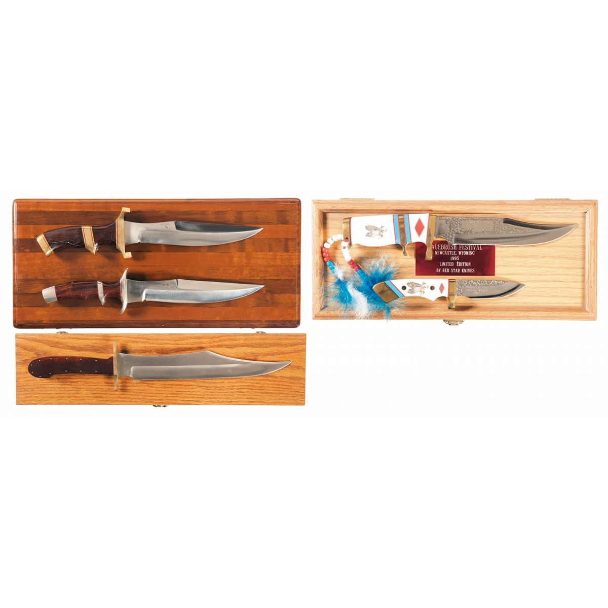 1) Cased pair of Tom Morlan knives, numbered "299" and "300", 8" clip point blades, wood and metal grips. 300 has a cracked grip. 2) Cased Tom Morlan knife, 12" clip point blade, laminate grip. 3) Cased set of Red Star White Cloud Limited Edition knives, 8" and 4" blades, brass and white plastic grips. Inscribed for the 1995 Newcastle Sagebrush Festival. Are excellent to near new in condition unless noted above.