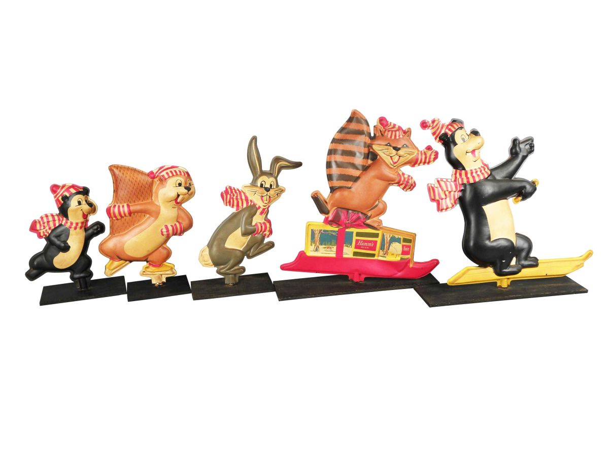 Lot of Five Celluloid Hamm's Beer Figures. Excellent original condition. Bear measures 13 inches tall.