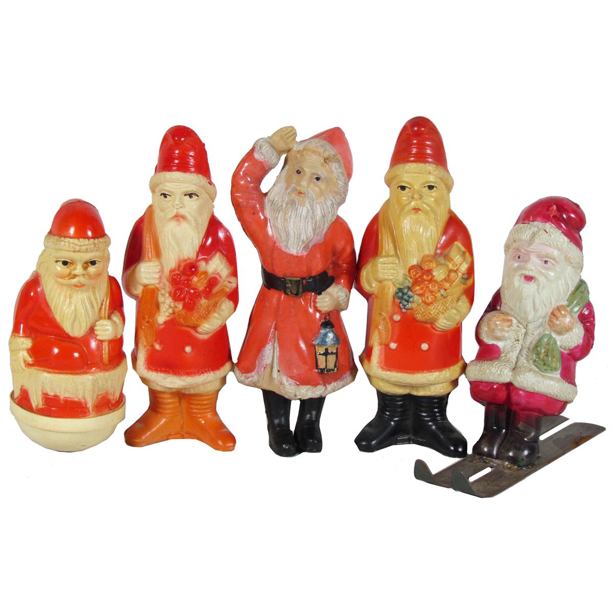 Five Celluloid Santa Figures, ca. 1930. Santa on tin litho skis, Rolly polly Santa, Santa rattle, Santa waving has hole in back. Overall very good condition. Tallest measures 5 1/4 inches tall.