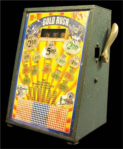 Five Cent Gold Rush Trade Stimulator. Good original condition with key. 8 1/2 X 12 1/2 X 7 inches.