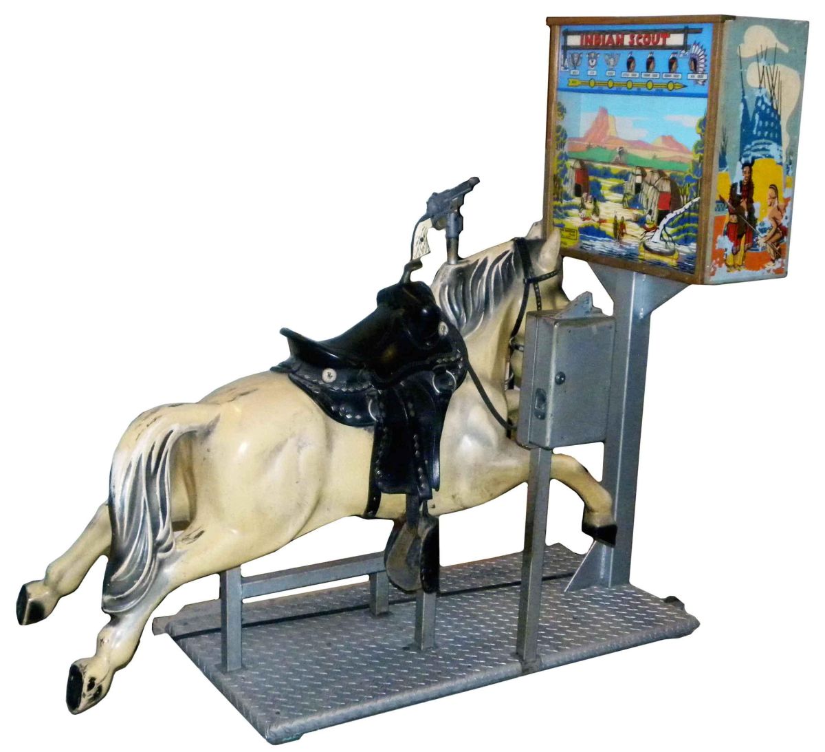 Child's Coin Operated Horse Ride and Shoot, "Five Cent Indian Scout". All Tech Industries, Hileah, FL. Good original working condition. 70 X 64 X 25 inches.