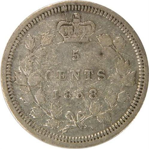 Canada Five Cents 1858 Large Date ICCS VF-20. A nice example with light golden gray toning
