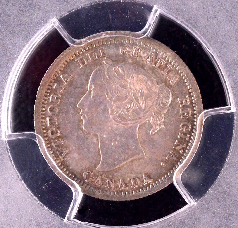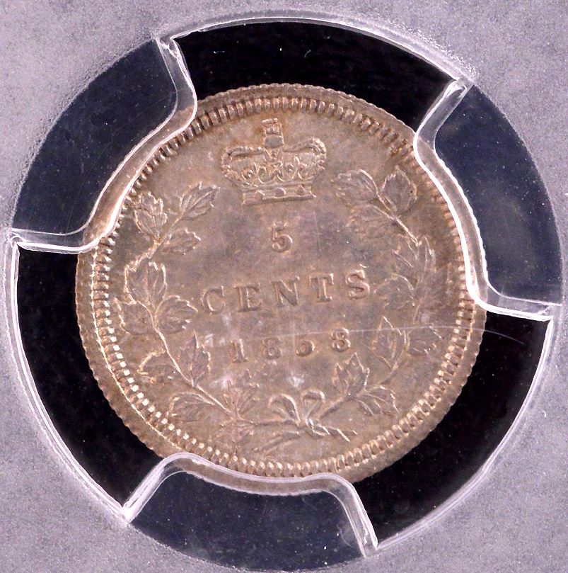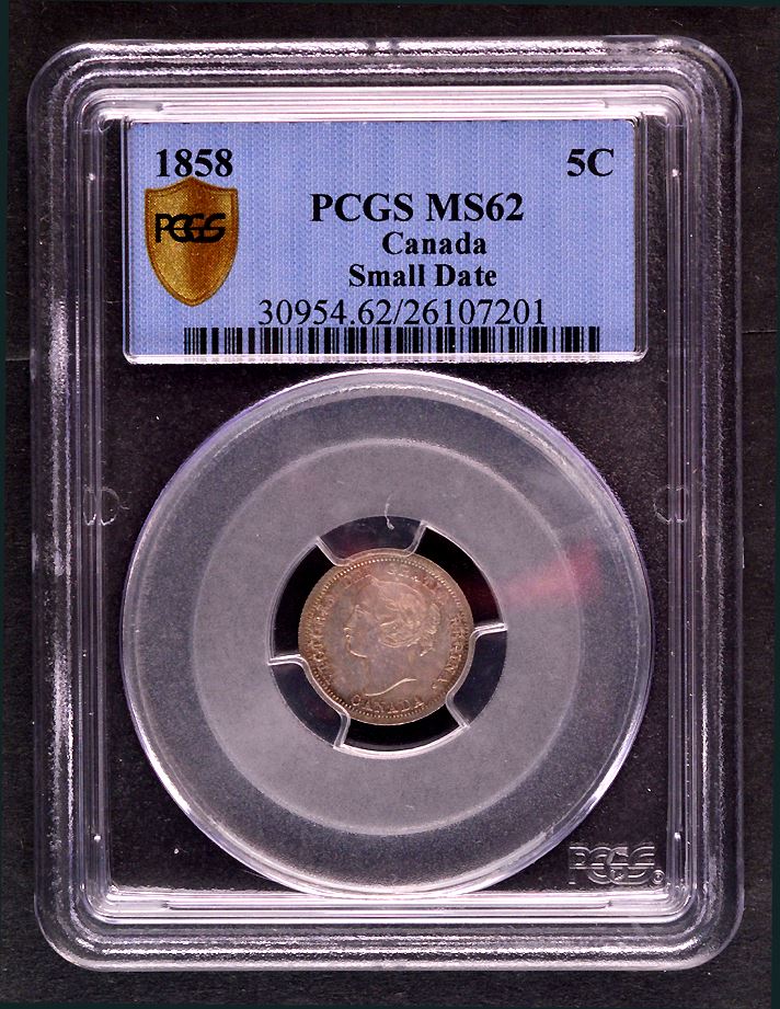 Five Cents Silver, 1858, Small Date, graded Mintstate-62, by PCGS. Light and attractive original toning. From an 1858 Currency set, with consecutive PCGS numbers.