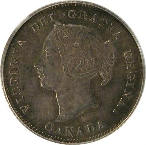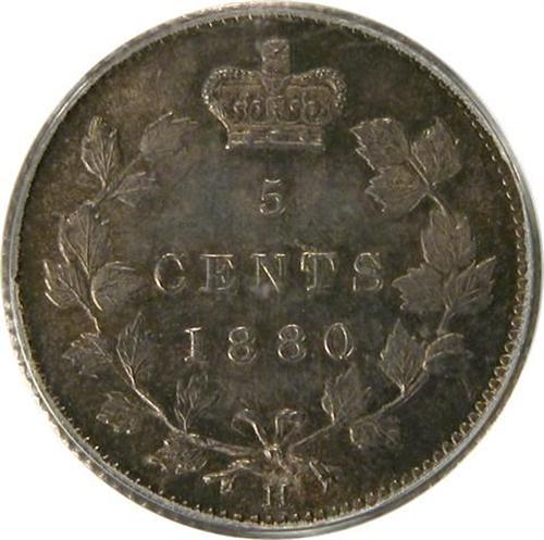 Canada Five Cents 1880H Obverse 3 PCGS MS-63. This is a fully struck piece with great lustre and rather flawless surfaces that are very attractively toned in light golden olives