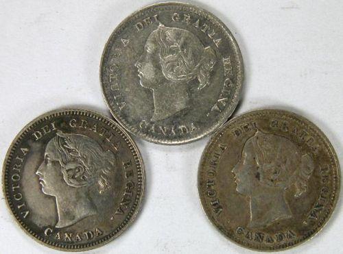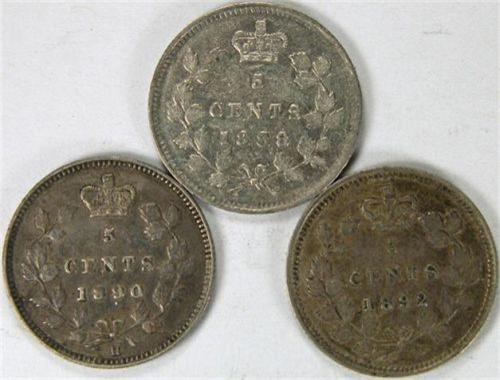 Canada Five Cents 1888, 1890H and 1892, all EF. Light toned