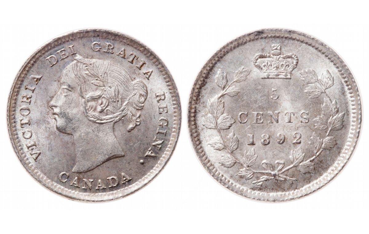 Five Cents. 1892. Obv. port. #2. ICCS Mint State-64. Brilliant, with hints of toning.