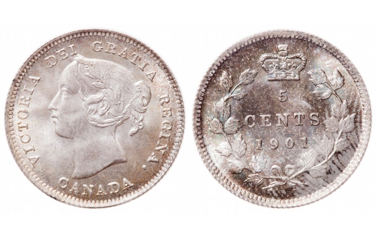 Five Cents. 1901. ICCS Mint State-66. The obverse with light golden toning, the reverse with touches of blue. Tied, 'Finest' graded by ICCS.